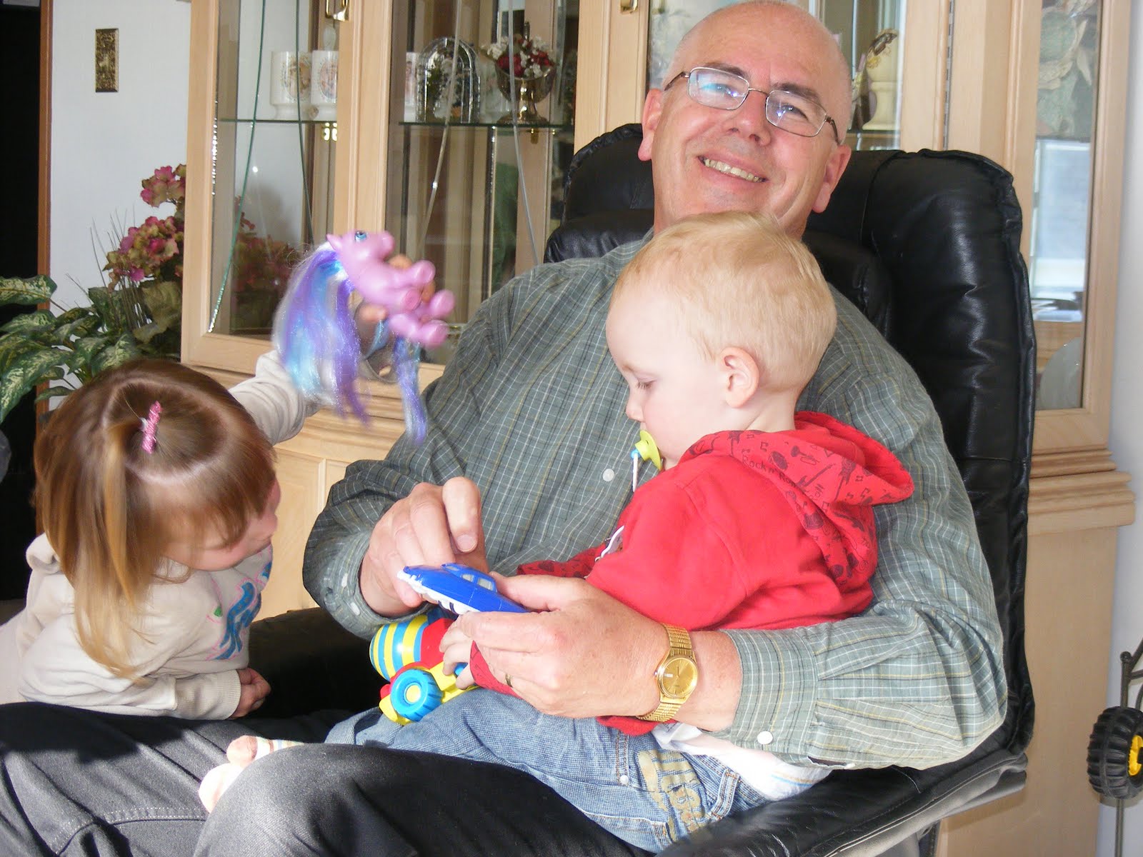Grandpa Moesker with Freddie and Jayda. Whose having the most fun?